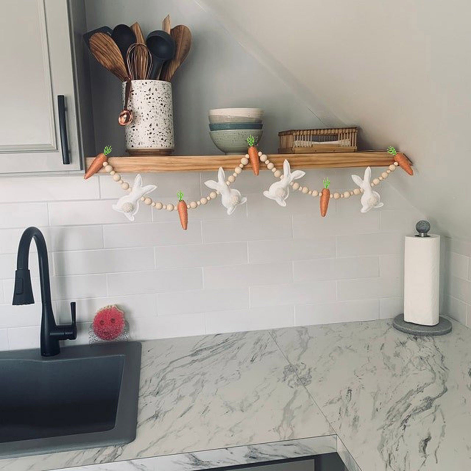 - Design: Wood bead garland with fabric bunnies and carrots